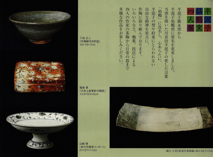 2023年03月26日(日) JR名古屋タカシマヤ様にて、半泥子仙鶴窯四人展が開かれます 次のとおり半泥子仙鶴窯四人展が開催されますので、ご案内します。 場所 ジェイアール名古屋タカシマヤ 11階美術画廊 日時 2023年3月29日(水)から4月4日(火)まで <午前10時~午後8時 (最終日は午後4時閉場)> 川喜田半泥子が生み出し、坪島圡平から藤村州二に受け継がれました仙鶴窯の作陶精神を引き継ぐ4人の作家(下田正人、坂口久司、福森資、山崎萌)の作品を展示いたします。